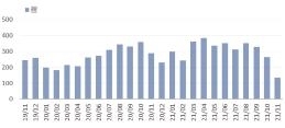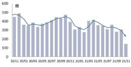 三大主力船型修理量走低。由于全球航运市场持续火爆,三大主力船型运力紧张,船东倾向于推迟船舶修期“带伤”运营。1~11月,散货船、集装箱船、油船分别修理改装4974艘、1753艘和2437艘,分别同比下降6.3%、4.1%和3.8%;液化天然气(LNG)船等其他型船修理7169艘,同比增长10.4%。