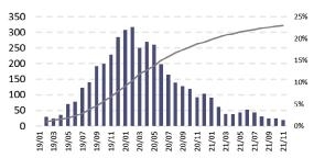 法规约束支撑压载水处理设备改装保持稳定。自2019年年底以来,压载水处理设备加装市场持续向好,全球约有18847艘、13.1亿载重吨船舶安装了压载水处理设备,以载重吨计,约占全球船队总量的60%。2021年1~11月,压载水处理设备加装3379艘,同比增加4.7%。