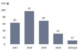 脱硫塔加装热潮明显消退。截至目前,全球已有4370艘、5.1亿载重吨船舶安装了脱硫塔,以大型船舶为主,按载重吨计约占全球船队的23.3%。随着脱硫塔安装业务日渐饱和以及环保要求日趋严格,更多船东开始对脱硫塔改装持观望态度。1~11月,全球脱硫塔加装数量为237艘,同比大幅下降76.6%。