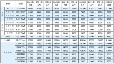 2021年3~12月世界主要船型新船价格一览表 单位:万美元