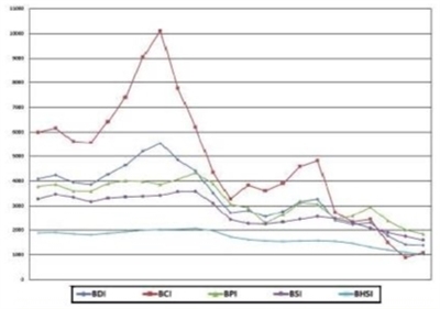 注:上图由本报采编中心根据相关数据制作。其中,BDI是指波罗的海干散货综合运价指数;BCI是指好望角型船运价指数;BPI是指巴拿马型船运价指数;BSI是指超灵便型船运价指数;BHSI是指灵便型船运指数。数据为周末数。