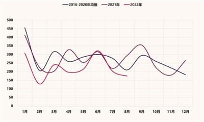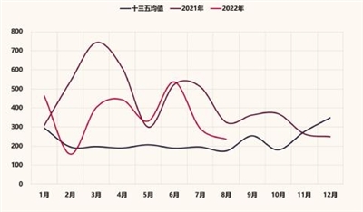 干散货运市场出现较大下滑。8月,散货船综合运费大幅下降至1.6万美元/天,环比下降25%,同比下降54.4%。波罗的海干散货综合价格指数(BDI)在8月底下滑至965点,月度均值环比下降32%。好望角型、巴拿马型、大灵便型等各型散货船运费均现降幅,大型船运费跌幅更大。今年以来,干散货船运市场出现较大波动,呈现前高后低的“倒V”字走势。年初,俄乌冲突及连带效应、主要经济体延续去年以来的复苏势头等因素在一定程度上对市场形成了支撑,但随着中国二季度疫情反复、房地产等基建行业需求大幅走弱,以及全球经济发展信心不足,铁矿石等占比较高的主要干散货物运输需求明显萎缩。未来市场走势将与全球经济形势以及煤炭等能源类干散货需求情况密切相关。