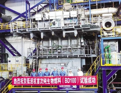 本报讯 近日,中国船舶集团有限公司旗下中船动力(集团)有限公司下属中船动力研究院在520毫米缸径船用低速原理试验机(RTX8)成功开展纯生物燃料(BD100生物柴油)试验,这是我国首次在大型船舶低速机上使用100%纯生物燃料。