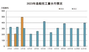 1~3月,全国造船完工量308万修正总吨,同比增长13.2%;承接新船订单量736万修正总吨,同比增长66.9%;3月底,手持船舶订单量5221万修正总吨,同比增长34.9%。