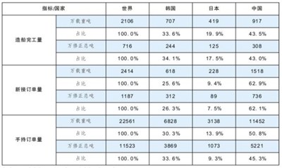 按修正总吨计,中国造船完工量、新接订单量、手持订单量分别占世界市场份额的43%、62.1%和45.3%。