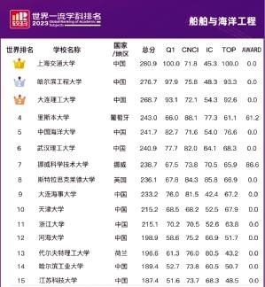 软科今年的排名显示,船舶与海洋工程学科排名共有来自全球18个国家和地区的50所高校上榜,其中来自中国内地和中国香港的高校有26所,不仅上榜数量超过“半壁江山”,居全球第一,而且相比去年增加了8所。排在第二位的是英国,共有6所高校上榜。在船舶与海洋工程学科排名前十的高校中,中国内地高校占据7席,同样位居全球第一。与此同时,上海交通大学、哈尔滨工程大学和大连理工大学分别以280.9分、276.7分和268.7分位居前三,包揽全球船舶与海洋工程学科排名冠军、亚军和季军。
