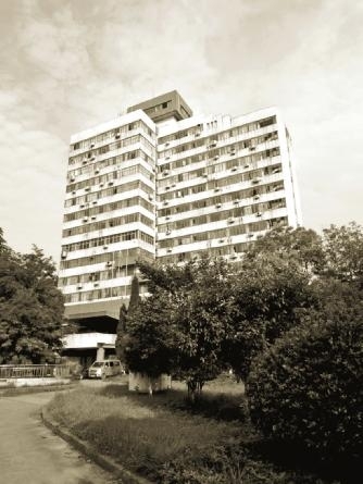 这座大楼始建于20世纪80年代末。记得那是1990年的盛夏,七一〇所大部队从江南的七里沟搬迁到宜昌市北山坡时,她就已经矗立在那里了。那时的她外形简洁方正,墙体由红白相间的“马赛克”组成,再配上红色瓷砖的点缀,使得她庄重而不失优雅,细腻中散发出特有的大气。与周边简陋民房相比起来,显得格外吸睛。