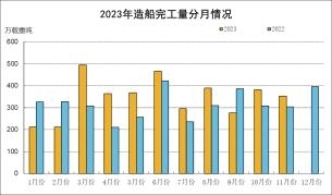 1~11月,全国造船完工量1487万修正总吨,同比增长32.2%;承接新船订单量2402万修正总吨,同比增长31.8%;11月底,手持船舶订单量5680万修正总吨,同比增长29.4%。