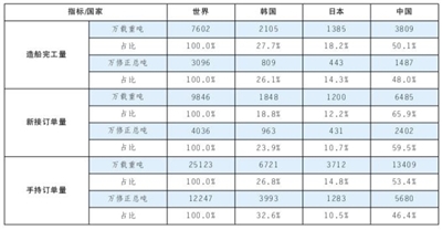 按修正总吨计,中国造船完工量、新接订单量、手持订单量分别占世界市场份额的48%、59.5%和46.4%。