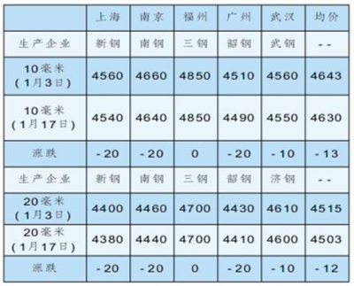 本报讯 记者 王进 报道 近期,铁矿石供需偏向宽松,矿价高位回调,钢材成本有所下移,而淡季钢材需求疲弱态势不改。在此行情下,船板现货价格转头下行。据我的钢铁网统计,1月17日,10毫米船板现货均价4630元/吨,比两周前下跌了13元/吨;20毫米船板现货均价4503元/吨,比两周前下跌了12元/吨。