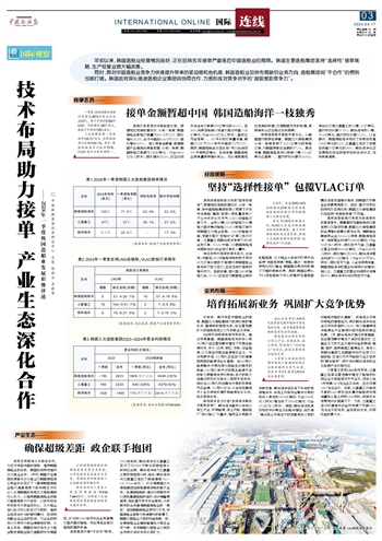 高附加值船舶订单成为效益增长的重要推手。随着高附加值船舶的订单承接以及陆续开建,韩国三大造船集团的业绩增长前景也更加乐观。据韩国金融信息企业FnGuide预测,韩国造船海洋一季度营业利润为1669亿韩元(约合9.0亿元人民币),同比扭亏为盈;三星重工营业利润为840亿韩元(约合4.5亿元人民币),同比增长约329%;韩华海洋营业利润为173亿韩元(约合9000万元人民币),同比扭亏为盈。从全年预测来看,韩国造船海洋的营业利润预计将增加2倍以上,三星重工的营业利润预计将增长83%,韩华海洋也将实现扭亏为盈。