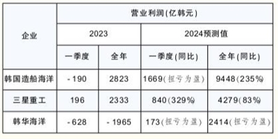 表3 韩国三大造船集团2023~2024年营业利润情况 (数据来源:各企业财报及FnGuide)