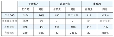 日本主要造船企业2023财年前三季度(2023.4~2023.12)经营业绩显示,造船企业经营业绩整体向好。日本联合造船(JMU)营业收入同比上升,净利润实现扭亏为盈。三井E&S营业收入和营业利润均同比上升,净利润实现扭亏为盈。内海造船营业收入和利润均实现同比大幅上涨。名村造船营业收入和利润均同比上升,净利润略有下滑。