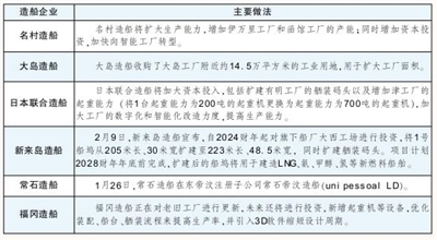 近期,已有部分造船企业开始扩大生产建造能力,如名村造船计划增加旗下伊万里工厂和函馆工厂的建造产能;大岛造船收购了大岛工厂附近约14.5万平方米的工业用地,用于扩大工厂面积;日本联合造船将扩建有明工厂的舾装码头,增加津工厂的起重能力;新来岛造船将对旗下大西工场进行资本投资,扩建1号船坞和舾装码头。还有部分造船企业计划在海外建造工厂,常石造船将在东帝汶建设新工厂,扩大生产能力。预计未来一段时间,有实力的日本造船企业将继续扩大生产能力,但从整体看,产能扩张规模不会太大。