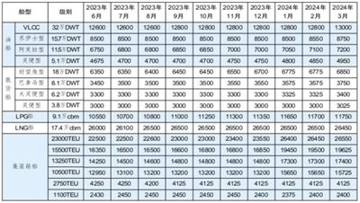 2023年6月~2024年3月世界主要船型新船价格一览表 单位:万美元
