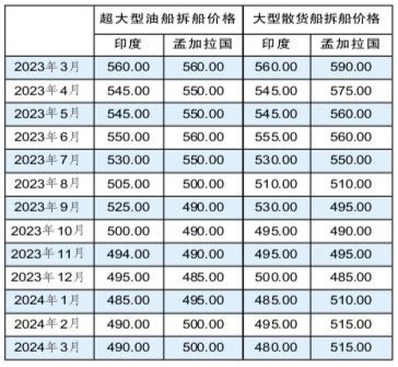 2023年3月~2024年3月印度和孟加拉国拆船价格 单位:美元/轻吨