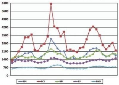 注:上图由本报采编中心根据相关数据制作。其中,BDI是指波罗的海干散货综合运价指数;BCI是指好望角型船运价指数;BPI是指巴拿马型船运价指数;BSI是指超灵便型船运价指数;BHSI是指灵便型船运指数。数据为周末数。