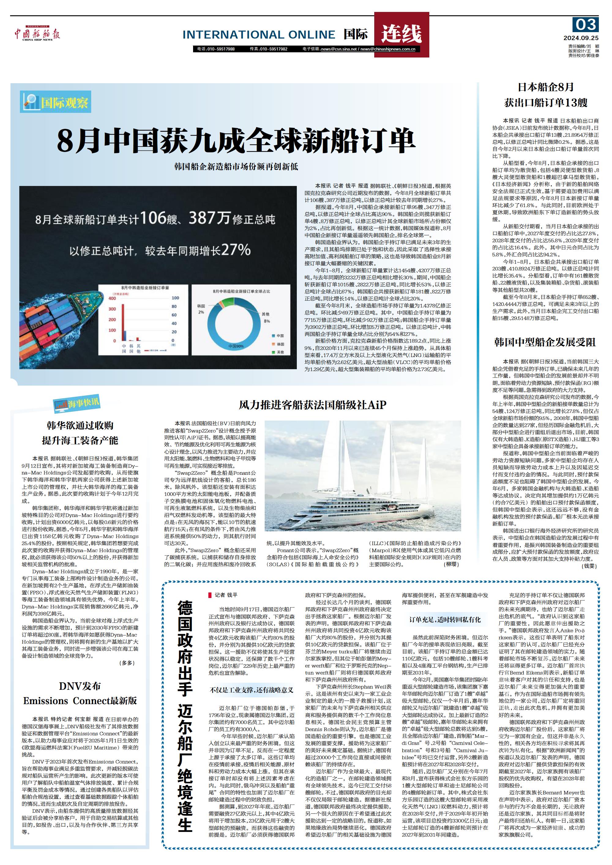 8月中国获九成全球新船订单