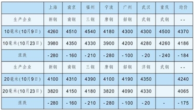 本报讯 记者 王进 报道 随着宏观利好政策刺激的效应“降温”,钢价冲高受阻后近日迎来回调行情。在此背景下,船板现货价格掉头下行。据我的钢铁网统计,10月23日,10毫米船板现货价格为41860元/吨,比两周前下跌了184元/吨;20毫米船板现货均价为4065元/吨,比两周前下跌了175元/吨。