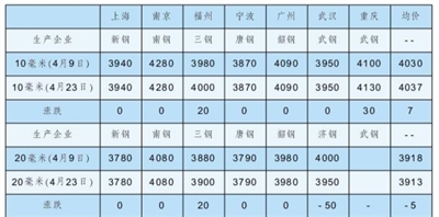 本报讯 记者 王进 报道 宏观预期及外部扰动延续,近期钢价以震荡运行为主。在此背景下,船板现货价格变化不大。据我的钢铁网统计,4月23日,10毫米船板现货价格为4037元/吨,比两周前上涨了7元/吨;20毫米船板现货价格为3913元/吨,比两周前下跌了5元/吨。