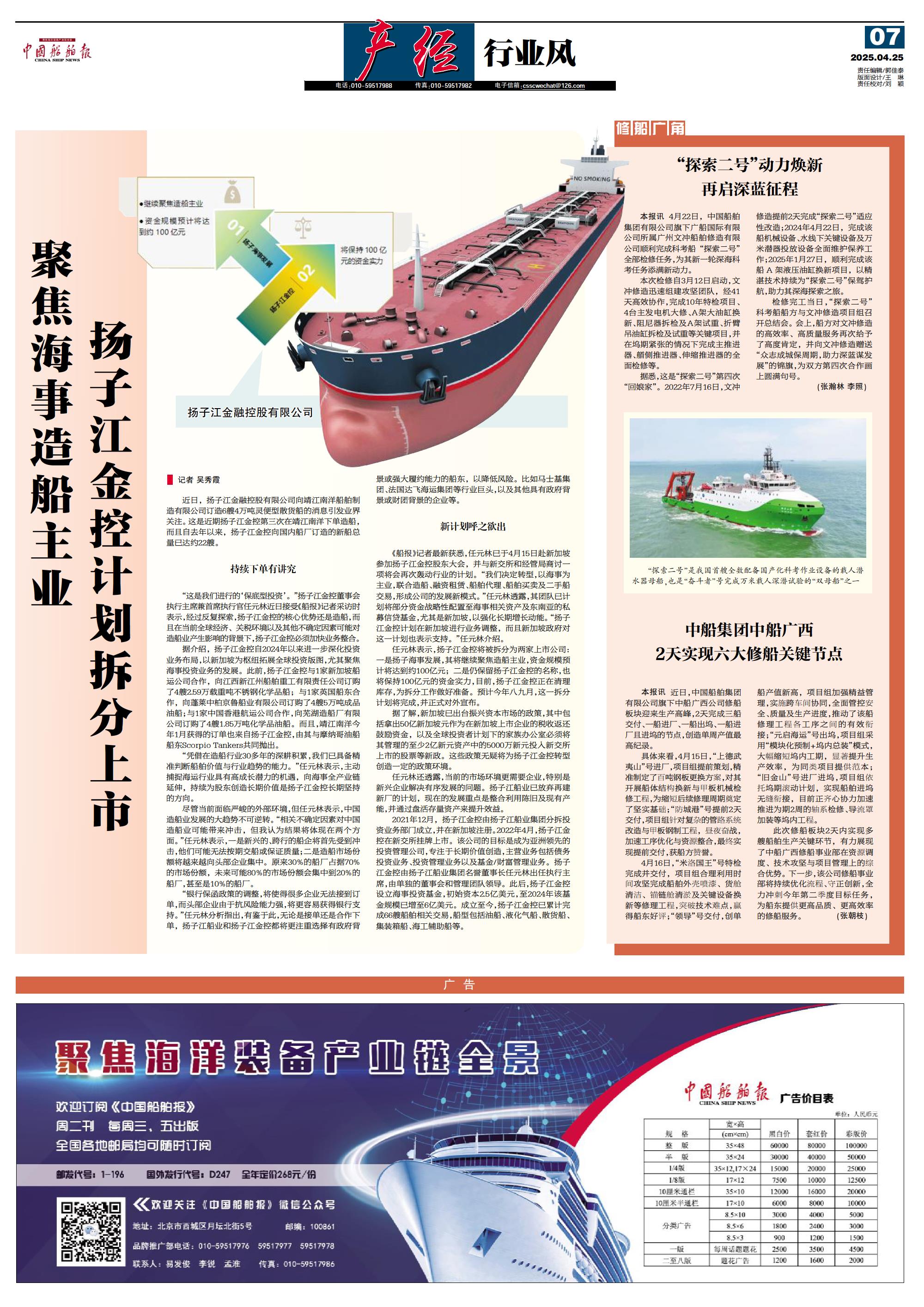 聚焦海事造船主业 扬子江金控计划拆分上市