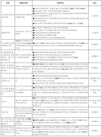 此外,韩国政府在2023年还出台了其他具体实施政策,主要包括三个重点方向:一是持续发力解决劳动力不足的问题;二是通过金融手段和创造需求,助力韩国船企接单;三是扩大投资,支持韩国造船业实现绿色、智能升级发展。其中,韩国产业通商资源部和法务部联合发布《造船业引进外籍劳动力解困方案》,以迅速向人力资源严重不足的造船业输送外籍劳动力;韩国政府发布《造船产业金融支援扩大方案》,增加预付款保函授信额度;成立“海运产业危机应对基金”,为韩国航运业提供金融支援,支持其订造绿色船舶,同时韩国政府带头订造了46艘环保动力船舶。在此基础上,韩国政府计划向氢、氨等零碳船舶技术研发,LNG运输船、电力推进船核心技术国产化,以及人才培养等领域投入巨资,全力支持韩国造船产业实现升级发展。