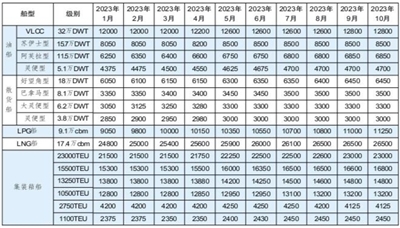 2023年1~10月世界主要船型新船价格一览表 单位:万美元