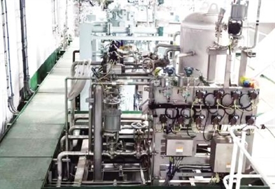 本报讯 近日,搭载中国船舶集团有限公司旗下中国重工青岛双瑞海洋环境工程股份有限公司GasLink船用液化天然气(LNG)供气系统(FGSS)的中远海特7000车位双燃料汽车滚装船试航归来。调试过程中每个环节试验均一次性通过,标志着青岛双瑞首个高压FGSS(见下图)成功交付。