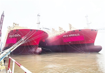 本报讯 记者 刘志良 报道 10月15日,中国船舶集团有限公司旗下江南造船联合中船贸易为太平船务建造的14000TEU液化天然气(LNG)双燃料动力系列集装箱船首制船“KOTA EAGLE(鹰城)”号和2号船“KOTA EMERALD(翠城)”号同日命名,其中“鹰城”号于当日签字交付。
