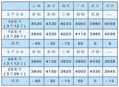 本报讯 记者 王进 报道 受部分钢厂减产消息提振,加之开工季需求继续恢复,钢市交易量价齐升。在此背景下,近期船板现货价格先跌后涨。据我的钢铁网统计,3月26日,10毫米船板现货价格为4059元/吨,与两周前价格持平;20毫米船板现货价格为3945元/吨,比两周前下跌13元/吨。