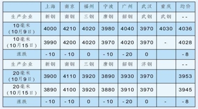 本报讯 记者 李琴 报道 国庆长假期间,钢材库存有所增长,市场基本面承压运行,节后需求不及预期,钢材价格震荡偏弱运行。据我的钢铁网统计,10月15日,10毫米船板现货均价为4028元/吨,比10月9日下跌8元/吨;20毫米船板现货均价为3945元/吨,比10月9日下跌8元/吨。
