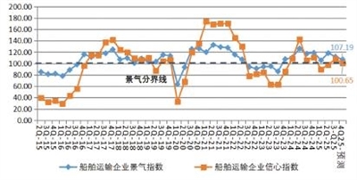 中国航运景气调查显示,2025年第四季度中国航运景气指数预计为106.43点,较上季度下降5.2点,维持在微景气区间;中国航运信心指数预计为108点,较上季度下降4.4点,进入微景气区间。